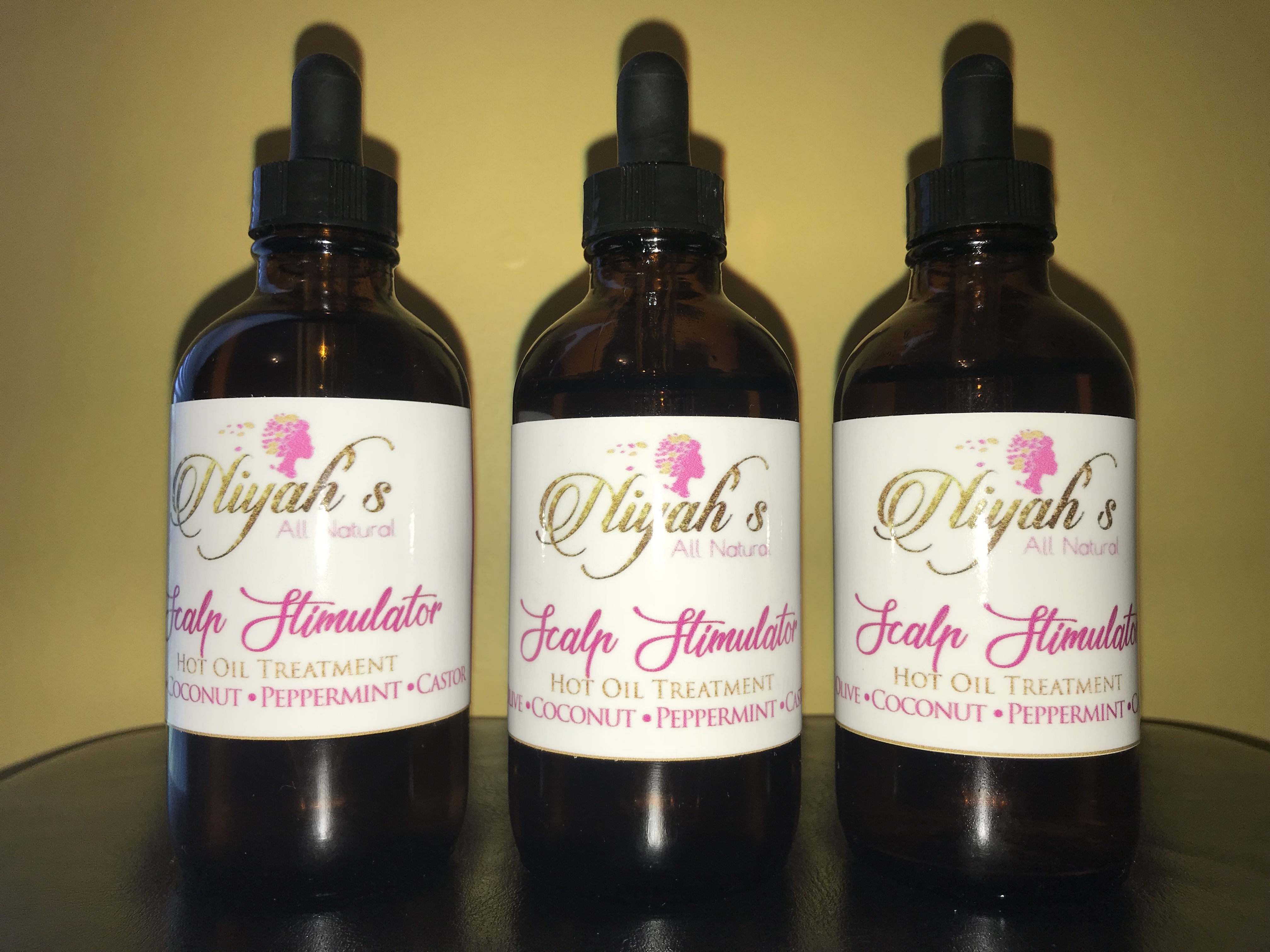“Scalp Stimulator” is a hot oil treatment containing nourishing oils such as black castor oil, olive oil, coconut oil, etc. The oils are very light weight. This product is used to stimulate blood flow to the scalp, resulting in hair growth. It is also used to replenish dry hair.